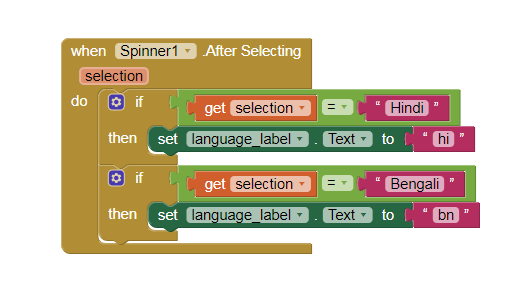 First you have to create a block that will transfer main language to code language, so you need If Then block and language_label.