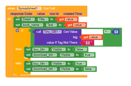 after 1st spreadsheet go cell it will check if the book is already bought or not, if the book if bought then it will return with value 1 and it will visible Download button instead of Buy button but if it returns a value of 0 then it will invisible Download button and show Buy button