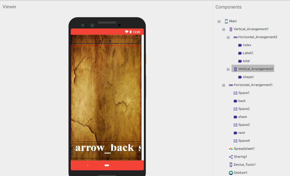 Add a Vertical Arrangement (Vertical_Arrangement2 at my AIA) into the Main Vertical Arrangement (Vertical_Arrangement1 at my AIA), it will be dragged after the Horizontal arrangement(Horizontal_Arrangement2 at my AIA) where Numbering or Index will show. Drag the Shayari label into this new Vertical Arrangement(Vertical_Arrangement2 at my AIA). I will create Swipe into this Vertical Arrangement(Vertical_Arrangement2 at my AIA), now make this arrangement’s Align Horizontal and Align Vertical as Center. Now drag Gesture extension and done.