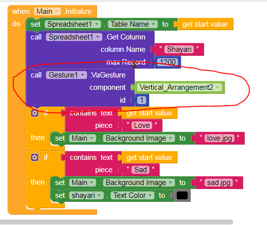 Just drag Gesture’s VaGesture and in Component I added my newly added Vertical Arrangement and at Id insert any number, because we will not work with Id here, here VaGesture means Vertical Arrangement Gesture, you can also see there are many Blocks like VsaGensture which means Vertical Scroll Arrangement Gesture etc. use the suitable block from suitable component